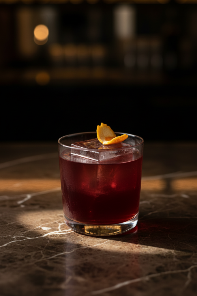 A deeper, contemplative pour served over ice. Pom cacao reduction and cacao nib bay leaf water create a rich, layered base, balanced by house orange cordial. Finished with a flamed orange garnish, this cocktail leans warm, earthy, and complex.